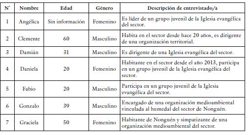 En el sector de Nonguén se hicieron diez entrevistas semiestructuradas (tabla 2). Los principales criterios para intencionar la muestra fueron: ser personas residentes en el territorio y que participaran en alguna de las organizaciones comunitarias del sector mencionadas previamente.