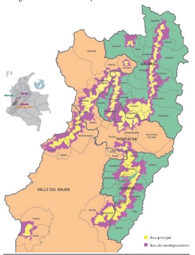 A partir de estas condiciones excepcionales, en el año 2011 la Unesco reconoció el pccc como Patrimonio Mundial de la Humanidad, enalteciendo de este modo las relaciones entre los campesinos de la zona andina del país con el cultivo del café. En la figura 1 se muestran las zonas principales y de amortiguamiento de los departamentos de Caldas, Quindío, Risaralda y el Valle del Cauca.
