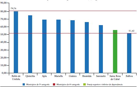 Para los municipios de Risaralda, estos tienen en promedio una dependencia del 66,1 %, superior a los departamentos de Caldas y Quindío. Así mismo, se halla que solo dos poseen una dependencia inferior al 60 %: por un lado, Santa Rosa de Cabal (quinta categoría) y, por otro, Balboa (sexta categoría). Por su parte, se evidencia que el 77,8 % de los municipios del pccc del departamento indican una dependencia a las transferencias y regalías superior al 60 % de sus ingresos totales, alcanzando cifras elevadas cercanas al 80 %, como es el caso de Belén de Umbría.