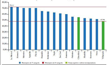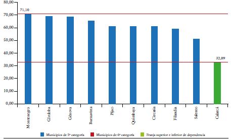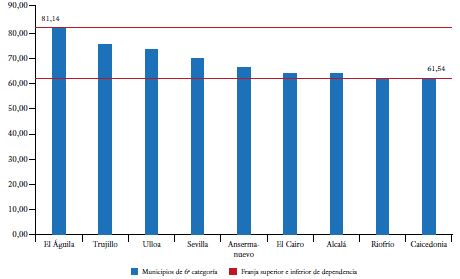 En términos generales, del total de los municipios analizados de los cuatro departamentos, se tiene que, en promedio, la dependencia de las entidades territoriales de sexta categoría es del 65,11 %, mientras que para las de quinta categoría es del 47,61 %.