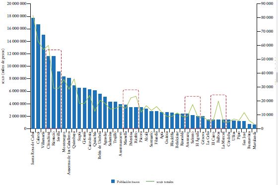 Con base en lo anterior, y entendiendo que los municipios vía ingresos tributarios y no tributarios pueden obtener ingresos corrientes de libre destinación, comprendidos como los ingresos corrientes excluidas las rentas de destinación específicas, es decir, el recurso económico con el que cuentan las entidades territoriales para invertir de manera autónoma de acuerdo con sus intereses y necesidades sin que se requiera el visto bueno o aprobación del ente central, se hace indispensable que los territorios del pccc fortalezcan sus capacidades técnicas y administrativas para recaudar impuestos y contribuciones locales, de tal manera que la gestión de sus propios intereses y competencias pueda orientarse hacia una adecuada administración y protección del territorio. En esta medida, al estudiar el comportamiento de los icld de los 47 municipios que hacen parte de la zona principal del pccc, se pueden observar en la figura 2 la baja capacidad de recaudo de la mayoría de estos territorios e importantes variaciones de icld con respecto al número de habitantes.