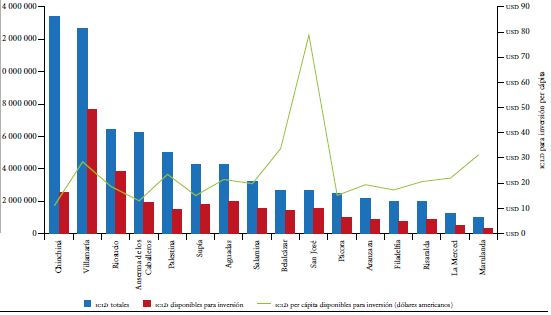 Por otro lado, al observar los recursos de los municipios por habitante para invertir, en promedio, los del pccc del departamento de Caldas disponen de 25 dólares por habitante para desarrollar inversiones a lo largo de la vigencia fiscal, siendo San José el que presenta mayor disponibilidad, con 79,5 dólares por habitante.