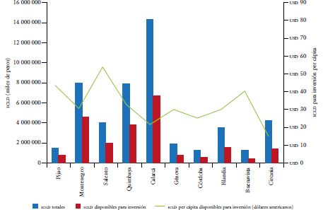 En cuanto al departamento del Valle del Cauca, en la figura 6 se presenta el comportamiento de los icld totales de los municipios del pccc del departamento versus los icld disponibles para inversión, así como los icld per cápita.