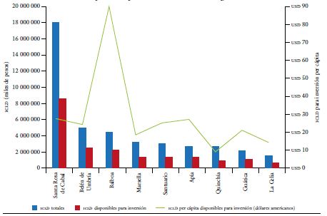 Por otro lado, al observar el comportamiento de la ejecución de los icld y su capacidad efectiva para convertirse en recursos de inversión o, en otras palabras, la capacidad real de los municipios para invertir en el territorio desde una perspectiva per cápita (medida en dólares), 4 se percibe que los mayores icld no significan mayores recursos para inversión, debido a la composición del gasto territorial, en especial porque una significativa porción de los recursos se destina para financiar el funcionamiento de las entidades.