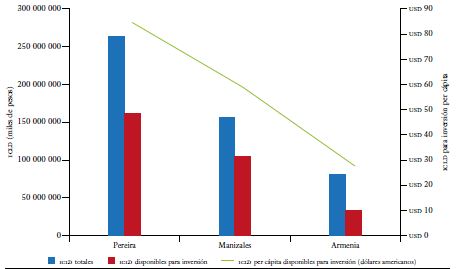 De igual forma, este tipo de municipios ostenta una disponibilidad de recursos para inversión del 67,2 % en Manizales, del 61,2 % en Pereira y del 41,3 % en Armenia, este último manifestando un comportamiento no tan notorio en esta materia. Así mismo, a nivel de icld per cápita para inversión, Pereira dispone de 84,4 dólares por habitante, seguido por Manizales, con 59,2 dólares, y por Armenia, con 27,9 dólares.