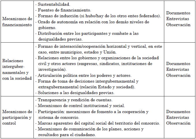 Se realizó una investigación de carácter cualitativo que tuvo como base documentos (gubernamentales y de otra naturaleza), entrevistas y observación, en la perspectiva de la investigación cualitativa de Godoy (1995). Se trata de un estudio de caso múltiple (Yin, 2010). El objeto es el caso de asociacionismo territorial como manera de cooperación federativa para la evaluación de problemas comunes y oferta de servicios públicos y fue desarrollado a través de la observación, descripción y análisis de dos consorcios públicos: 1) CIF: Consorcio Intermunicipal de Frontera, y 2) CIGA: Consorcio de Informática en la Gestión Municipal. Los criterios para la selección de los casos analizados fueron los descritos en el Cuadro 2.