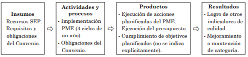 La entrega de estos recursos financieros se ofrece como un incentivo en contrapartida de una mayor calidad de servicio y de mejora en resultados educativos (Weinstein ...[et al], 2010). Se exige a las escuelas el cumplimiento de un Convenio de Igualdad de Oportunidades y Mejoramiento Educativo, que contiene un conjunto de compromisos y obligaciones. Los más relevantes son garantizar la atención gratuita a estos estudiantes, no seleccionarlos en el ingreso y realizar acciones para su retención. En cuanto al mejoramiento, se solicita que cada escuela que recibe esta subvención elabore e implemente un Plan de Mejoramiento Educativo (PME), que cuente con metas de efectividad y un conjunto de objetivos y acciones en cuatro áreas de gestión educativa: liderazgo, gestión curricular, convivencia y gestión de recursos. El PME debe además desarrollarse en un contexto de participación y de rendición de cuentas a la comunidad, a las familias y al Ministerio de Educación (Mineduc). En términos de resultados, la exigencia más relevante es la del compromiso de mejoramiento en resultados educativos, lo que es medido con el puntaje que la escuela alcanza en la prueba SIMCE, que es estandarizada y censal.