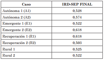Por su parte, tampoco se ve que las variables de segmentación de la muestra que fueron utilizadas señalen, por ejemplo, que la categoría de la escuela, o su porcentaje de estudiantes prioritarios tenga alguna relación clara con el IRD-SEP. Por un lado, la escuela autónoma con mayor porcentaje de estudiantes prioritarios y la emergente con mayor porcentaje de estudiantes prioritarios logran un mayor índice de implementación, mientras que la otra escuela emergente alcanza el resultado más bajo en el índice.