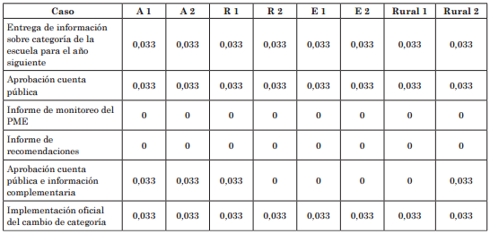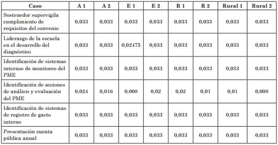 Tal como puede observarse, en las escuelas analizadas se dan resultados relativamente homogéneos de respuesta a las definiciones de la SEP por los actores. Este nivel de respuesta puede ser calificado como intermedio, puesto que su rango fue de entre 0,5 y 0,66. Es decir, no se observó ninguna escuela que tuviera niveles de implementación cercanos a la totalidad de la expectativa definida en la Ley.