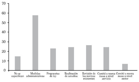 Debido a la ausencia de reglamentación los acuerdos pactados en las mesas de negociación en los servicios públicos no son en sí mismos vinculantes como sí lo es en el caso del sector privado. Por la misma razón, la encuesta indagó en las medidas que comprometen los servicios para implementar los acuerdos. El Gráfico 6 resume las respuestas. Los datos muestran que sólo un 16% de los servicios que llegaron a acuerdo no especificaron las medidas a utilizar para llevar a cabo los compromisos. La medida más popular para implementar los compromisos, entre aquellos que sí las especifican, es de carácter administrativo. Sólo un cuarto de los servicios compromete en paralelo o en sustitución de las medidas administrativas la presentación de un proyecto de ley, la realización de estudios, la revisión de normas existentes, la creación de un comité o una nueva mesa de negociación en el servicio o a un nivel superior.