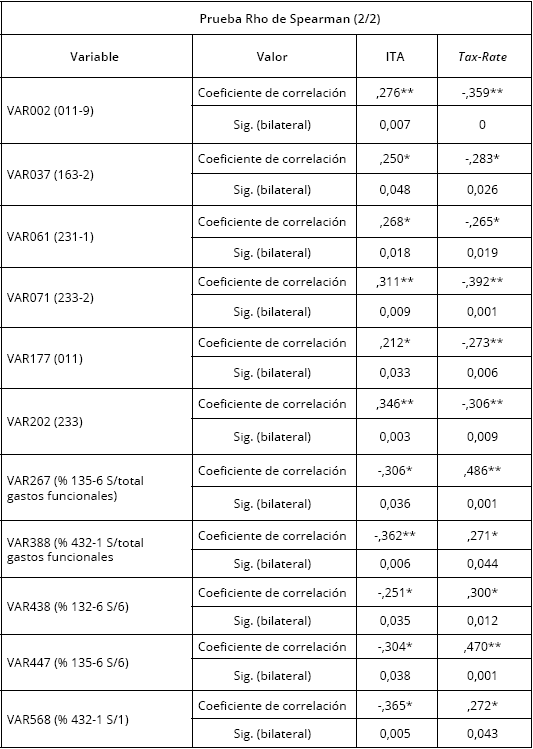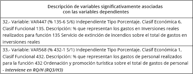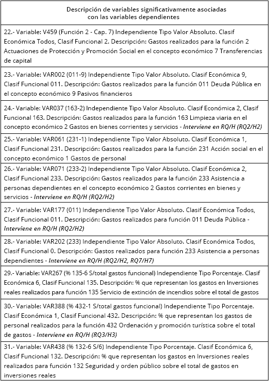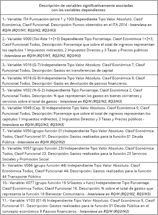 Se partió de más de 1.000 variables presupuestarias como consecuencia de los resultados obtenidos en el cálculo de correlaciones no paramétricas (Rho de Spearman). De ellas, se han seleccionado las 31 variables significativamente asociadas con ITA y Tax-rate, de forma simultánea, las cuales figuran relacionadas en el Anexo III y descritas en el Anexo IV.