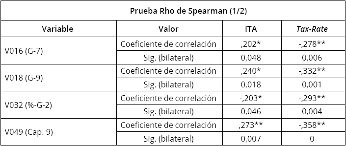 a) Que las variables expresadas en forma de porcentajes presentan simultáneamente una asociación directa con la variable Tax-rate e inversa con la variable ITA. De la misma manera, las variables que se expresan en términos absolutos (€) presentan simultáneamente una asociación inversa con la variable Tax-rate y directa con la variable ITA.