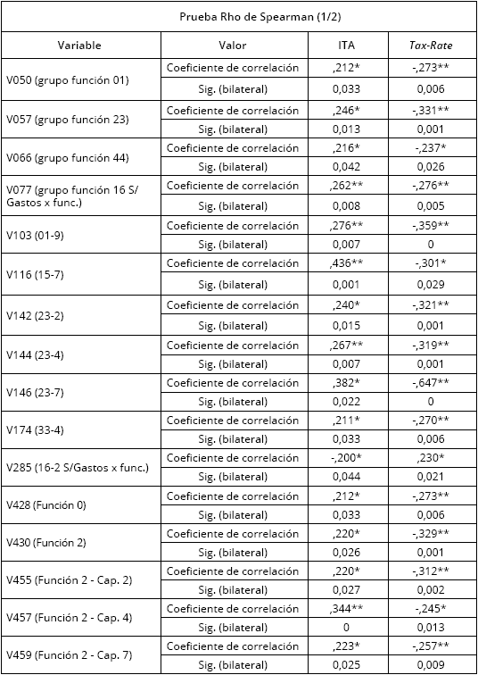 3. En función del hallazgo de la no normalidad de las variables y como tercer paso se ha sometido a estas a un estudio de correlaciones no paramétricas (Rho de Spearman) con el propósito de identificar asociaciones relevantes de las variables con respecto a la puntuación obtenida en el ITA y la proporción de la financiación vía impuestos (Tax-rate) (capítulos 1, 2 y 3 del presupuesto de ingresos) de cada uno de los ayuntamientos analizados.