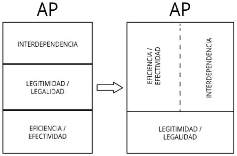 Lo que se ha observado es que el discurso y el movimiento de la AP de la legitimidad / legalidad alcanzaron tal fuerza y densidad social que fueron preponderantes, sobredeterminantes. Las exigencias de legalidad, transparencia, rendición de cuentas atravesaron todos los procesos administrativos e introdujeron nuevas normas y procedimientos, pero se superpusieron a las exigencias de la eficiencia y la efectividad o se mantuvieron externas a ellas y no lograron presentarse o convencer que son requisitos necesarios adicionales, aún si insuficientes, para lograr la efectividad directiva del gobierno. La AP legal no logró penetrar en los procesos administrativos que aceptaban la ley como una obligación respetable, pero que administrativamente no aportaba nada para el cumplimiento eficaz y eficiente de las tareas y servicios administrativos. En las entidades administrativas fue reconocida la suprema importancia del valor de la legalidad, pero los procesos administrativos, justamente por su naturaleza e intencionalidad, siguieron procediendo conforme al principio del uso eficiente de los recursos y la eficacia de resultados. Más aún, el imperativo de la legalidad en los procesos administrativos no se dotó con los recursos legales y coactivos necesarios para penalizar las corrupciones, las opacidades, las discrecionalidades arbitrarias. La AP de la legitimidad-legalidad ha carecido paradójicamente de efectividad en los asuntos sensibles de corrupción, arbitrariedad, opacidad.