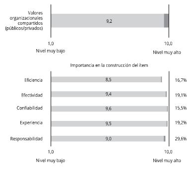 elaboración propia.Por otra parte, teniendo en cuenta las percepciones de los trabajadores del ítem “valores organizacionales compartidos” (tanto públicos como privados), el nivel medio de las percepciones de los participantes del estudio en relación con ellos se ubicó en 9,2 puntos de un posible 10, lo que se considera un valor “muy alto” (Figura 3).