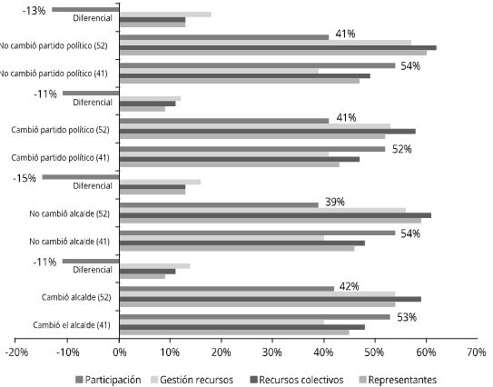 elaboración propia.Los cuestionarios se estructuran en ejes de representación, gestión, información y participación ciudadana con el ánimo de agrupar los ítems y homogenizar la presentación de los resultados. Al pasar a 52 indicadores se añaden ítems específicos de gestión económica. Como resultado, comparando los cuatro indicadores que los dos cuestionarios tienen en común (Tablas 7 y 8), se observa que en aquellos ayuntamientos donde se ha producido un cambio de alcalde se mejoran tres de los cuatro indicadores y solo desciende el grado de transparencia en el caso de la participación. Observando estos datos, en la Tabla 6, se deduce que el cambio de alcalde sí conlleva una mejora de la transparencia, pero que la incorporación de una nueva categoría de indicadores hace que descienda la media de cumplimiento de la transparencia. De todas formas, este mismo patrón se repite en el caso de los ayuntamientos donde no ha cambiado el alcalde, ya que se mejora en todos los indicadores salvo en el de participación.
