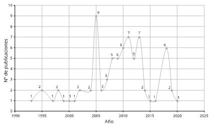 Estados Unidos es el país en el cual el marco se aplicó en la mayor cantidad de casos (58), seguido por Canadá y el Reino Unido (4) y Francia (3). La frecuencia disminuye en el resto de países donde se ha identificado la aplicación del marco: Alemania, Suiza, Suecia y Japón (2 casos en cada uno); Italia, Países Bajos, Noruega, Dinamarca, Bélgica, Irlanda y Corea del Sur (1 caso en cada país.) El estudio realizado, evidencia variaciones en la aplicación del marco desde el año 1994 hasta inicios de 2020. Al respecto, es posible identificar trayectorias sostenidas de crecimiento en el número de investigaciones por año (el mayor en 2005) y momentos de decrecimiento (el mayor en 2006) (Gráfico 2)
