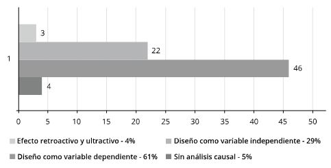 No se encontraron investigaciones en las que se haya desarrollado un argumento ontológico de causación y causalidad de manera explícita (Jackson, 2016). Ante esta debilidad, el análisis se centró en inferir de las investigaciones el comportamiento del diseño como variable dependiente o independiente. Al respecto, se presentaron las siguientes modalidades causales: diseño como variable dependiente, diseño como variable independiente, diseño como variable dependiente e independiente y no derivación causal. En esta última categoría se incluyeron las investigaciones que no proponían interacción causal entre las instancias (contexto-diseño/diseño-contexto) sino que, o describían la dinámica política de alguna entidad en particular (Abbie, 2012) o generaban argumentos causales al interior de una sola entidad (Gollust y Lynch, 2011). En mayor medida, las investigaciones se inclinan por utilizar el marco analítico de Ingram y Schneider asumiendo el diseño de políticas como variable dependiente (Gráfico 5).