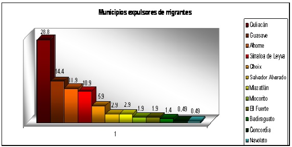 Source: taken from Valenzuela (2005).5.9% of migration in Sinaloa found in Phoenix, Arizona in 2003, was from Choix (Valenzuela, 2005). It ranks the fifth after Culiacan, Guasave, Ahome and Sinaloa de Leyva. It can be stated that this percentage corresponds to the first three municipalities due to its population size. The next one is a poor municipality: Sinaloa de Leyva, that has the same characteristics of poverty and lack of opportunities, similar to the municipality of Choix (Sánchez , 2015).