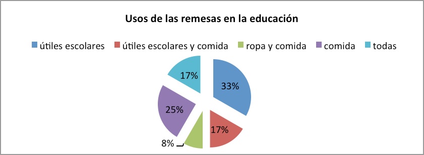 Source: prepared by the authors based on data from the questionnaire conducted for this research Use of remittances on education expenses: school supplies school supplies and food clothing and transportation food all the previous itemsRegarding the use of remittances in education, 33% is used on school supplies, 25% on food within the school day; the rest of the remittances is spent in other needs such as school clothing and transportation. This is the reason why remittances that support education are few, due to the fact that they do not meet the needs of students. But these resources beyond money sent, as Moctezuma (2011) says, they are "instrumental actions that are moved through affective actions" such as "make my home", "save money to get married", "have a professional in the family" (p. 39), etc.