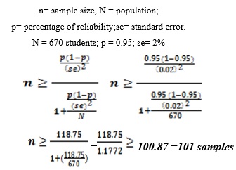 The target population of the study is 670 students from institutions in middle school education of the Municipal Head of Choix. The strategy to collect data would be based on the randomness in the samples determined. Therefore, it was decided to apply the stratified random sampling, since the characteristics of the population under analysis are quite homogeneous. Thus, a similar probability of selection to each and every one of the samples was assigned, and these in turn were divided into subgroups, with the possibility of separate analysis (Vladimirogva and Gutiérrez, 2014).