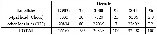 Source: Prepared with data from INEGI, 1990, 2000 and 2010Table 1 depicts the low population growth of the municipality of Choix. The municipal head contains the majority of the population, as this represents 28% compared to 72% of 327 localities in 2010. This concentration of population is due to the municipal head having more public and private services, an increased urbanization and economic dynamism, although this locality is still mostly in rural and some urban conditions.