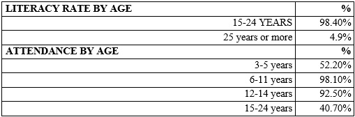 Source: Prepared with data from INEGI, 2010.In Choix, 98.4% of the population between 15 and 24 years old can write. The study sample was conformed by high school youth who are in the age range of 15 to 24 years. Only 40.7% of young working-age people attend school, this is probably due to the fact that most of the population this age is working, and in the case of women doing housework. Notably, according to Tovar (2007), "rural communities are offset in Mexico two years on average" (p 12); although the government has tried to intervene in education, building schools, from pre-school to uppersecondary level; thus educational opportunities grow, but its quality diminishes.The effort made to provide education is not compensated in educational quality.