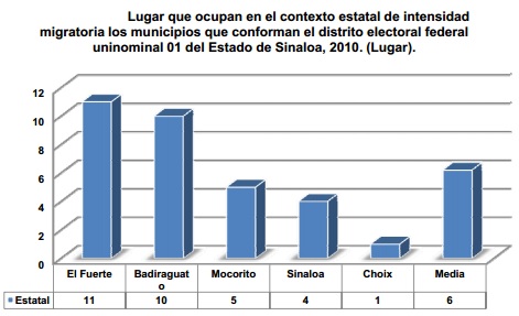 According to the Chamber of Deputies of the LXII Legislature, a municipality has a very high degree of intensity immigration if the place in the national context tends to 1 and it will have a very low degree if it tends to 2500. The graph shows that the following municipalities: El Fuerte, Badiraguato, Mocorito and Sinaloa have a low degree of migration intensity. They are placed between 1489 to 1171 (in terms of the country's municipalities) in the national context. Instead, Choix has an average degree of migration intensity and it ranks 929th in the national context (Center for Social Studies and Public Opinion [CESOP], 2004).