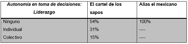 Por ejemplo, en caso de que se evidenciara el liderazgo con impacto político en las narco series “El cartel de los sapos” y “Alias el mexicano”, como eje de autonomía en la toma de decisiones, se podría hablar de equidad y empoderamiento líder en temas siempre encabezados por hombres. No obstante, el resultado para las mujeres en esta narco serie es negativo con más notoriedad en “Alias el mexicano”, donde ninguna de las mujeres ocupadas como 'mulas' posee algún tipo de liderazgo planteado; mientras que en “El cartel de los sapos” los personajes que 'no tienen alguna ocupación' definida, evidencian en bajo grado el liderazgo individual, enfocado a aspectos personales de cómo se concibe. Como por ejemplo Dulce, hija de un narcotraficante, a sus 20 años decide hacer caso omiso a sus órdenes y tomar la decisión de irse y alejarse de ese mundo ilegal que no comparte.