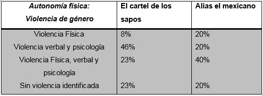 De esta manera queda en evidencia cómo está fuera de las manos de los personajes femeninos de estas narco novelas la autonomía física, cómo su cuerpo es manejado según lo disponga algún personaje masculino, que por lo general es algún malandro de la trama; cómo se plantea el control psicológico, advertencia verbal y repercusiones a nivel físico por no cumplir con las condiciones o las órdenes de los hombres con poder.