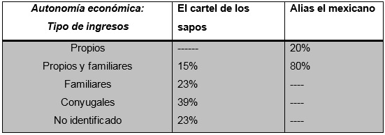 Ahora, los personajes femeninos de “Alias el mexicano”, tienen de alguna manera su sustento propio, a diferencia de las mujeres de “El cartel de los sapos”; ya que éstas no cuentan con la comodidad de un dinero fácil que les permita hacer nada. Al contrario, son niñas que vienen de familias con necesidades y de pueblos y zonas rurales, lo que les hace más difícil acceder a un empleo digno y confiable como para que tengan una autonomía económica; es decir, cuentan con menos oportunidades. El hecho de ser mujeres jóvenes, menores de edad, les permite tener algún apoyo en sus familias; sin embargo, su situación socioeconómica las obliga a buscar dinero, situación que las hace más idóneas y fáciles de engañar como para un trabajo embaucador.