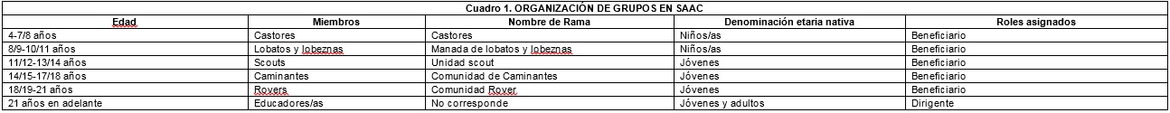Fuente: elaboración propia en base a datos obtenidos del sitio web oficial de SAACEl pasaje hacia las ramas superiores se produce mediante ceremonias realizadas periódicamente en los grupos scouts que indican el desarrollo de habilidades y aptitudes en las siguientes áreas de crecimiento: corporalidad, creatividad, carácter, afectividad, sociabilidad, espiritualidad y vida al aire libre, trabajadas en las ramas. El objetivo central de las ceremonias de tránsito es transmitir a las juventudes lo que la comunidad considera como valores fundamentales (Giménez, 2016) que, en los grupos estudiados se trata del escultismo y del catolicismo.