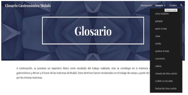Como principal resultado de esta investigación se logró concretar el glosario gastronómico. En este apartado se presenta la descripción de este repertorio léxico que constituye memoria cultural del ámbito gastronómico y del ser y el hacer de las matronas de Mulaló. Estos términos fueron recolectados en el trabajo de campo, a partir de la información dada por las mismas matronas.