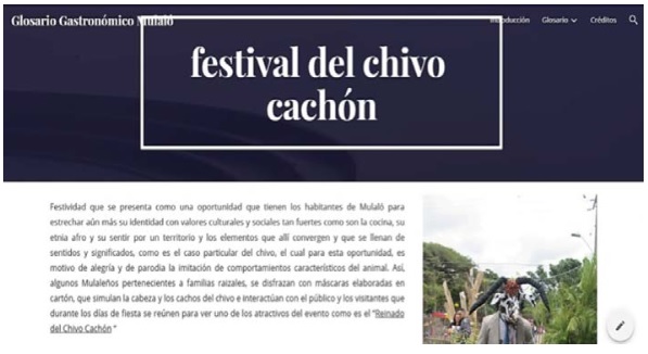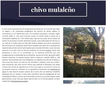 Lo anterior justifica centrarse en tan pocas entradas, pues cada una de ellas, en la medida de las posibilidades, se desarrolla a profundidad desde lo sociocultural, recalcando la relación entre cultura y gastronomía, como se observa en el siguiente ejemplo en el que se define al “chivo mulaleño:
