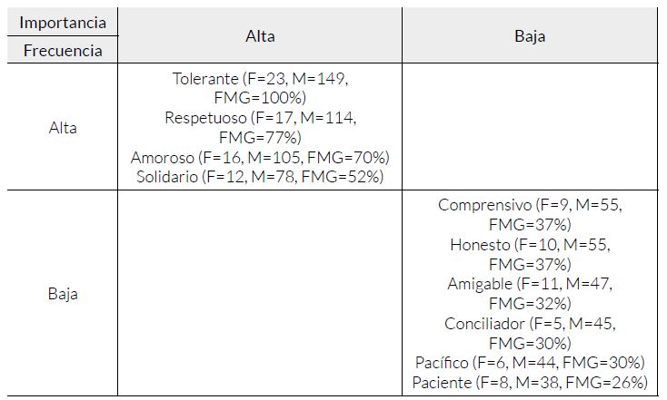 Se observa que las definidoras Respetuoso, Tolerante, Honesto, Paciente, Amable y Amigable configuran la zona central o núcleo de la RSNM de los estudiantes, indicando su relativa estabilidad en la memoria colectiva de los sujetos con el paso del tiempo. En el caso de la zona de periferia, se localizaron las definidoras Comprensivo, Amoroso, Confiable, Humilde, Cariñoso y Sincero.