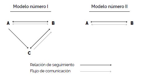 De igual forma, los concejales concentran la emisión de sus mensajes y las discusiones de los asuntos públicos con líderes de opinión dentro de la red y no democratizan sus emisiones a todos los usuarios. Por lo tanto, de acuerdo con Moya y Herrera (2016), bajo el modelo número I se analizó que A es el concejal, B es el líder de opinión y C son los ciber-ciudadanos (Ver figura 9). A y B (Modelo número II) mantienen una relación de discusión constante, mientras que C sólo es espectador de la discusión. Además, B es quien mayormente responde a los mensajes emitidos por C, ya que el interés de A es difundir información, usando erróneamente las redes sociales digitales.