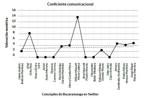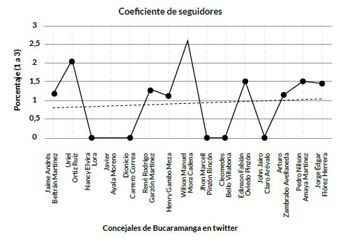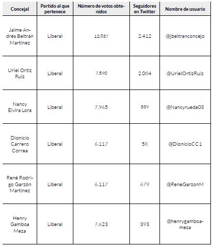 Para la fecha en mención los concejales del Partido Liberal, Jaime Andrés Beltrán Martínez, @jbeltranconcejo y Uriel Ortiz Ruíz, @UrielOrtizRuiz junto con el edil del partido Polo Democrático, Jorge Hernán Flórez Herrara, @JorgeFlorezSi, registran el mayor número de seguidores en Twitter: 2412, 2084 y 2050, respectivamente. Caso contrario ocurre con los concejales Dionicio Carrero Correa, @DionicioCC1, del Partido Liberal, Cleomedes Bello Villabona @CleomedesBello, del Partido de la Unidad Nacional y Jhon Marcell Pinzón Rincón, @Jhonmpinzon, también del Partido Unidad Nacional, quienes registran un número de seguidores menor a los 150. El más bajo @DionicioCC1 con 58, @CleomedesBello 96 y @Jhonmpinzon, 131.