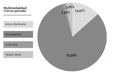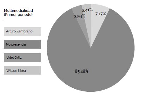 En ese orden lo que hace referencia a Multimedialidad se halló bajo uso de recursos digitales tales como imágenes, videos, audios, y formatos documentales en los tuits para el primer y tercer periodo de sesiones ordinarias de 2017. Tanto en el primero (85,48%), como en el tercer periodo (81,88%) de sesiones, la Multimedialidad es limitada. Quien obtuvo mayor porcentaje en ambos períodos fue el concejal Arturo Zambrano (@ArturoZambranoA), puesto que mediante el cruce de datos y la generación de las Figuras 3 y 4 es quien puntea los datos con 7,17% y 13,41% respectivamente. Mientras que Uriel Ortiz (3,94% y 1,45%) y Wilson Mora (3,41% y 3,26%), por su parte, presentan respectivamente las cifras mencionadas.