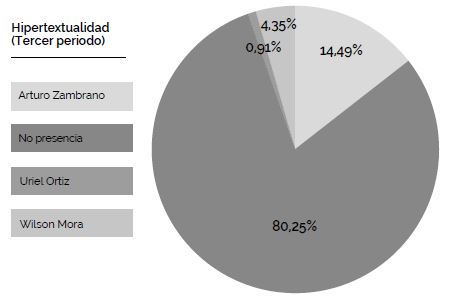 Ahora bien, entendida la Hipertextualidad desde el uso de enlaces para ampliar información en los tuis, hasta la generación y uso de hashtags (#), menciones (@) y retuits comentados o no por el concejal, Wilson Manuel Mora (@WilsonMora8890) obtuvo mayor porcentaje en el primer periodo (8,33%); sin embargo, quien encabeza el rango para el tercer periodo es Arturo Zambrano (@ArturoZambranoA) (9,79%). Frente al tercer periodo Uriel Ortiz (@UrielOrtizRuiz), obtuvo 0,91% siendo el más bajo comparado con Arturo Zambrano (14,49%).