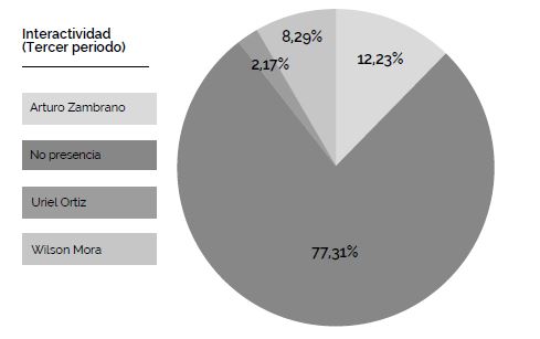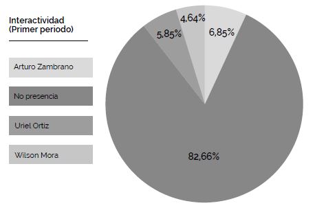 En la categoría Interactividad se buscaron los tipos de menciones, retuits y respuestas. Pueden ser colectivas, únicas, a entidades o ciudadanos digitales. En este sentido, el concejal considerado más interactivo es Arturo Zambrano (@ArturoZambranoA), del partido Centro Democrático, con 6,58% y 12,23%, en cada periodo analizado. Uriel Ortiz obtuvo 5,85 y 2,17% y Wilson Mora 4,64% y 8,29%, respectivamente.
