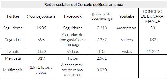 Al revisar los perfiles de los concejales desde la pestaña de la página web se evidenció el registro de correo electrónico y redes sociales: Facebook, Youtube y Twitter; de esta última, 14 de los 19 19 integrantes registraron cuenta (abril, 2017).