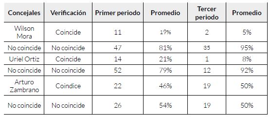 El concejal que más se acerca al 50% es Arturo Zambrano con 46% en el primer periodo y 50% en el tercero. Uriel Ortiz con 21% para el primer periodo y 8% para el tercer periodo. Finalmente, Wilson Mora con 19% para el primer periodo y 5% para el tercero.
