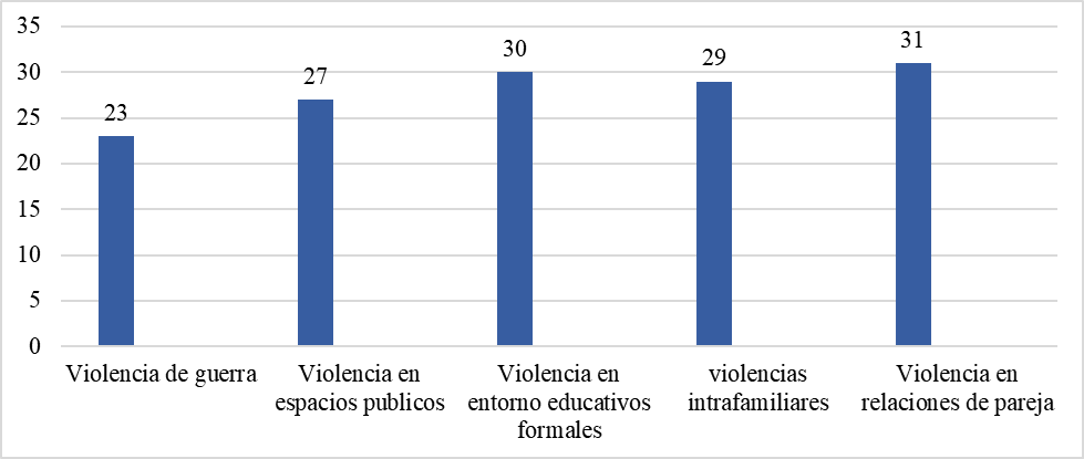 A continuación se procederá a dar cuenta de los resultados por nodos problemáticos referentes a las violencias vividas por los y las jóvenes, que fueron agrupadas por su emergencia en las narrativas cruzadas, en las que se profundizó en su comprensión con los relatos de las narrativas paralelas. Estos nodos son: (1) violencias de guerra, enunciadas en 23 de las narrativas cruzadas; (2) violencias en el espacio público, mencionadas en 27 oportunidades en las narrativas cruzadas; (3) Violencia escolar, mencionada en 30 carteleras; (4) Violencia intrafamiliar, que se enuncia en 29 de las mismas; y (5) Violencias en relaciones de pareja, las cuales aparecen enunciadas en 31 carteleras del ejercicio colectivo. Como cierre de los resultados daremos expresamente cuenta de emergencias del taller a nivel vivencial, en relación a sentimientos que expresaron los y las jóvenes, importantes de enunciar para comprender la significación de las violencias descritas.
