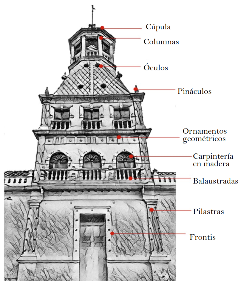 Como se puede apreciar en la figura 2, la Torre del reloj está implantada en un lote en forma de L y posee un patio central con tres cuerpos que lo rodean. Sus pisos son de doble altura y su fachada implementa elementos como columnas, balaustres y capiteles, que caracterizan la fuerza del estilo Republicano, destacando además las cornisas elaboradas con elementos ornamentales neoclásicos y las puertas enmarcadas por molduras, así como los óculos, las escaleras en madera, los postigos, los pisos, y las ventanas (ver figura 3).