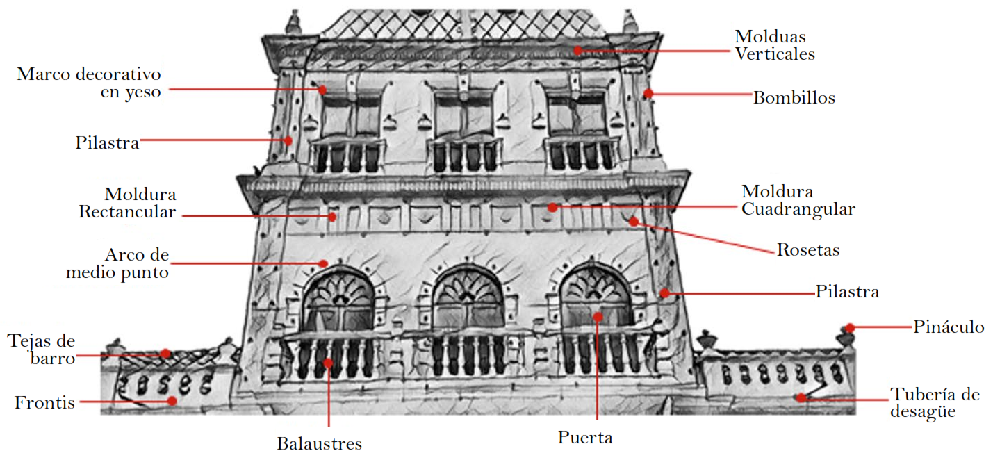 El acceso principal está enmarcado por pilastras y por una cornisa que separa el primer y segundo piso de la torre, en donde las pilastras tienen continuidad hasta el tercer piso. En la fachada principal se pueden observar tres puertas en madera de forma rectangular dentro de un marco adornado por molduras rectangulares dispuestas en la parte superior y en los laterales; además de un balcón individual compuesto por balaustradas. En la fachada posterior y en las laterales se encuentra una puerta de similares características a la implementada en la fachada principal. La cornisa entre el segundo y tercer piso posee molduras pequeñas dispuestas de manera vertical (ver figura 4).