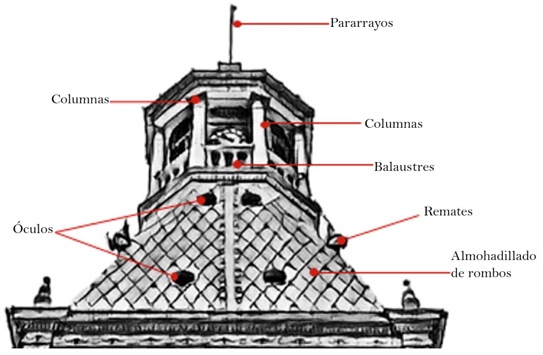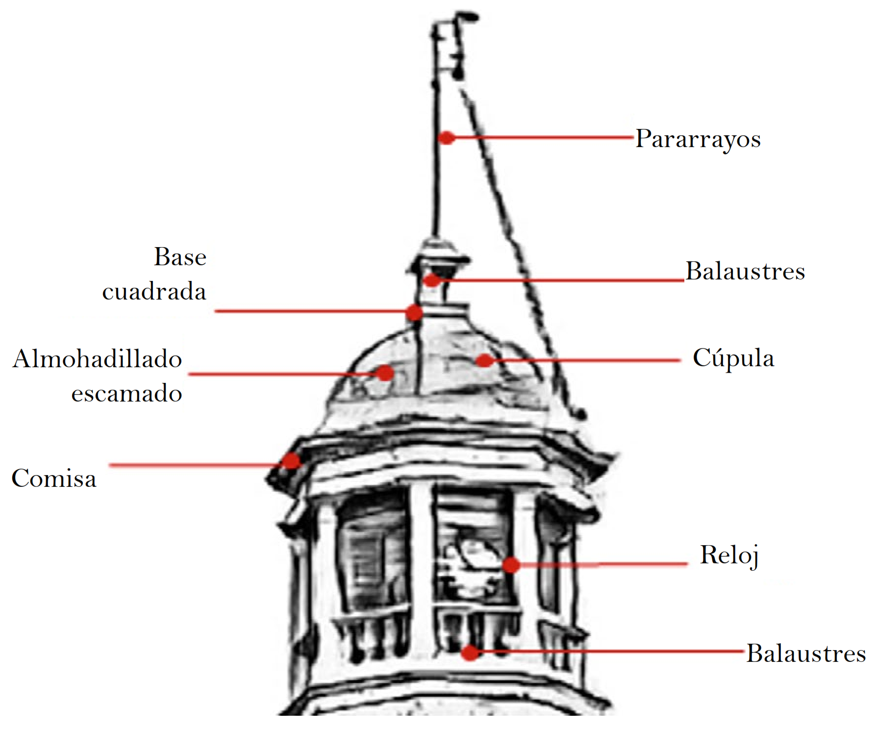 En el sexto piso se encuentra un reloj que es visible desde el exterior. La Torre remata en una cúpula octogonal apoyada sobre una cornisa, cuya estructura interior está compuesta por vigas de madera y un pararrayos sobre una base cuadrada (ver figura 6).
