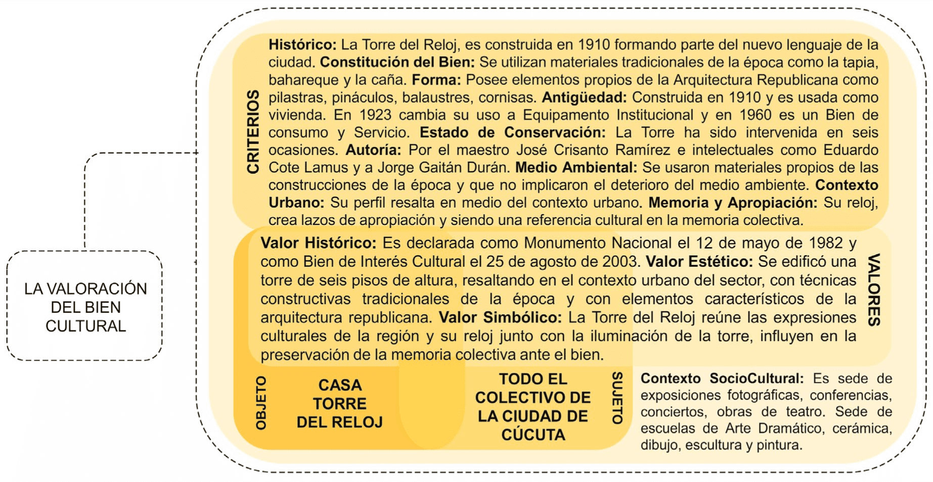 Es importante resaltar que uno de los valores agregados de esta investigación corresponde al estudio de los criterios de valoración para el Bien de Interés Cultural Torre del reloj, de acuerdo con lo establecido en el Manual para Inventario de Bienes Cultural Inmuebles del Ministerio de Cultura de Colombia (2005). Esto teniendo en cuenta que, en el año 2005, se establecen elementos complementarios para el proceso de valoración de los BIC.