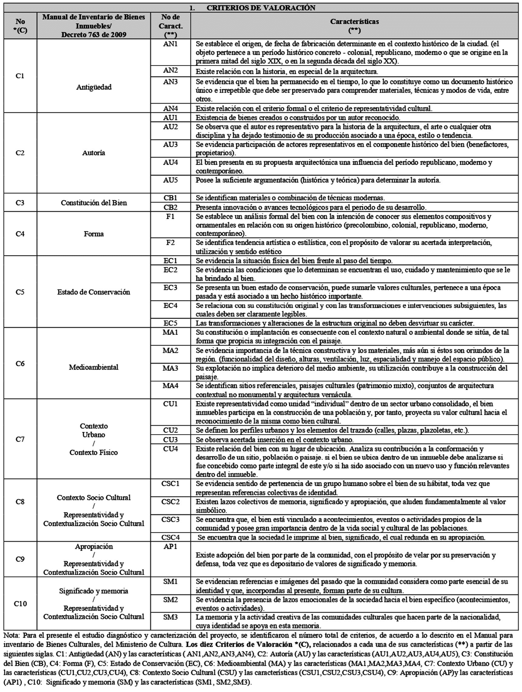 Paso 1: la escala de valoración formulada en la presente matriz se realizó teniendo en cuenta los valores (V)* definidos en el Manual de Inventario de Bienes Culturales del Ministerio de Cultura (2005) y en el Decreto 763 de la Presidencia de la República (2009). La estimación para cada una de las características corresponde al siguiente nivel de puntuación de uno (1) a cinco (5), siendo: uno (1) - nivel de apreciación nivel bajo; dos (2) - nivel de apreciación bajo; tres (3) - nivel de apreciación medio; cuatro (4) nivel de apreciación alto; y cinco (5) - nivel de apreciación muy alto.
