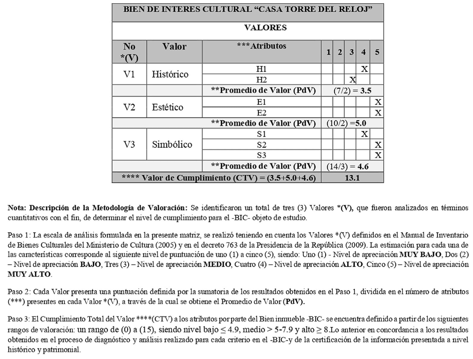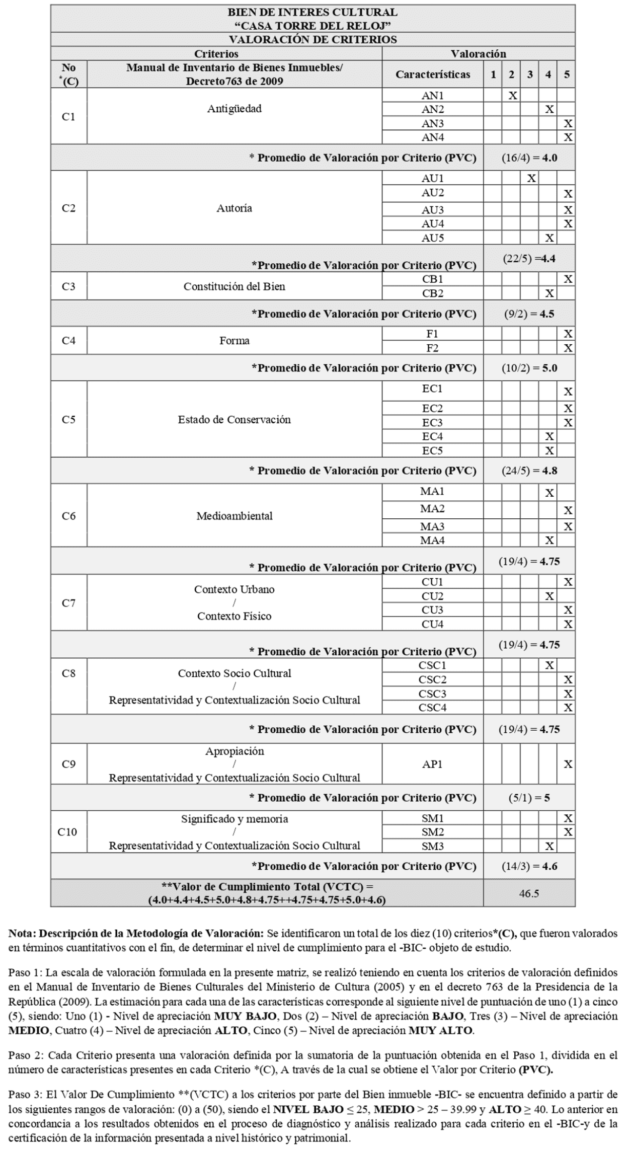 Se diseñó una matriz de valoración para el BIC sometido a estudio, la puesta en marcha de esta herramienta favoreció la orientación, atribución y definición del significado cultural de la Torre del reloj en la ciudad de San José de Cúcuta. La matriz de valoración está compuesta por diez criterios y tres valores (tablas 4 y 6). En la matriz se definió una escala de valoración independiente, que permitió establecer los criterios y los valores en términos cuantitativos con el fin de determinar su nivel de cumplimiento y el Promedio Total de Valoración (PTV) soportados en el análisis cualitativo del BIC resultante del trabajo de campo realizado, las entrevistas a actores claves y la búsqueda documental que permitió elaborar la memoria analítica para cada uno de los criterios evaluados.
