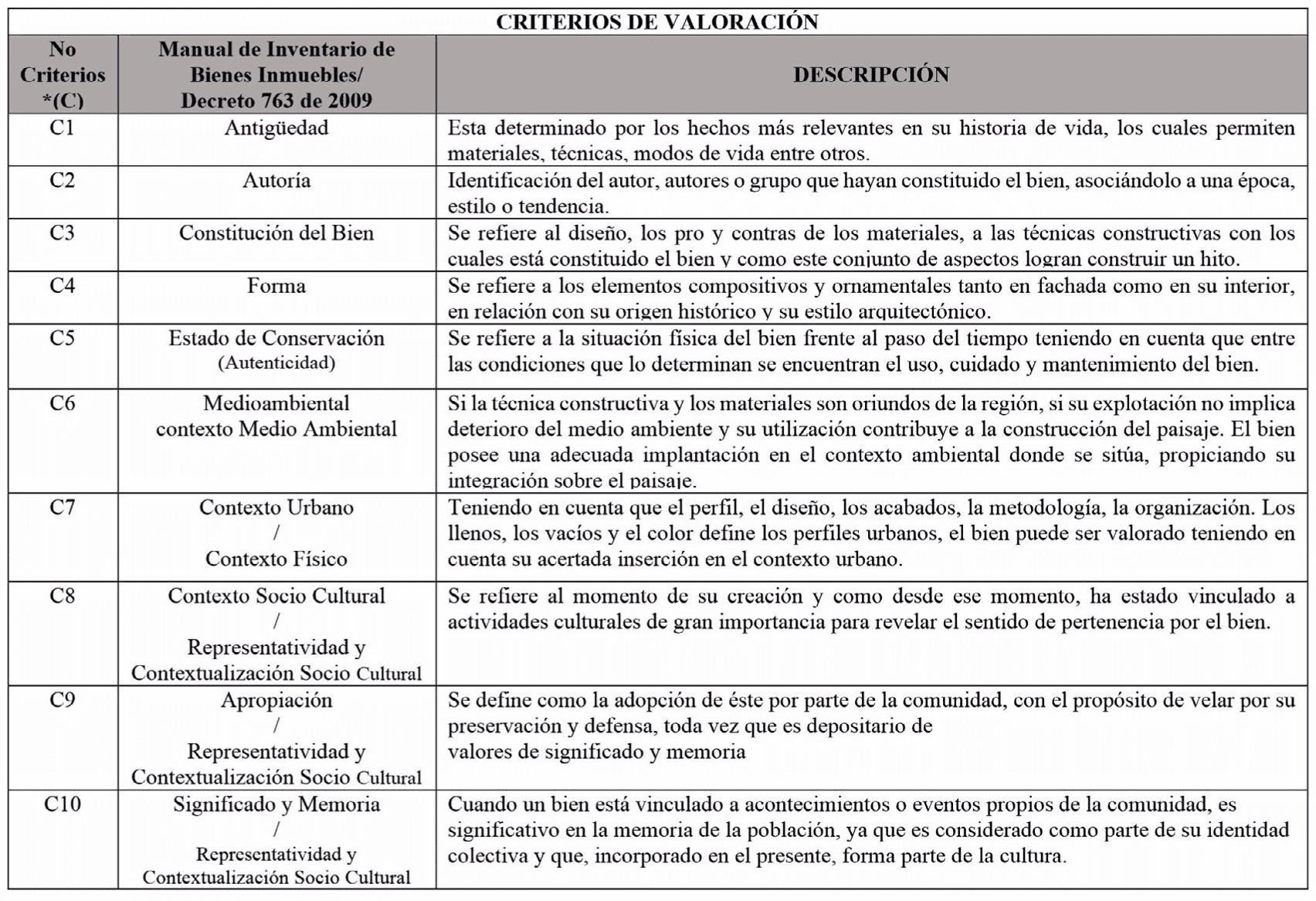De acuerdo con lo anterior, se reseñan los criterios de valoración contenidos en el Manual para Inventarios Bienes Culturales Muebles del Ministerio de Cultura de Colombia: